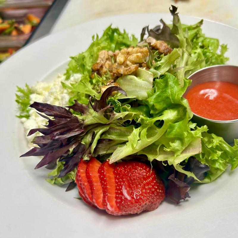 $ퟏퟐ.ퟎퟎ | $ퟏퟖ.ퟎퟎ • Mix of greens, strawberries, caramelized pecan, goat chesse and house made balsamic vinagrette | Add Halibut or King Salmon +$18.00 (Blackened or Grilled)