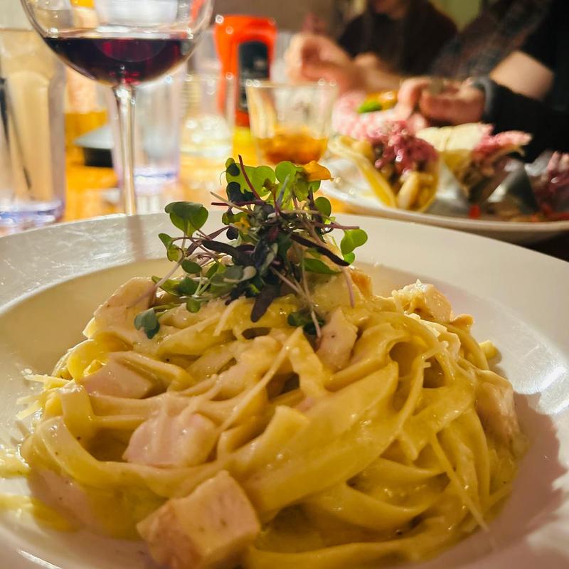 Glazed fettuccini with cilantro cream and grilled chicken with touches of butter