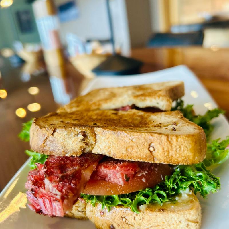 Pastrami, garlic aioli, lettuce, tomato, and red onion on gluten-free bread.