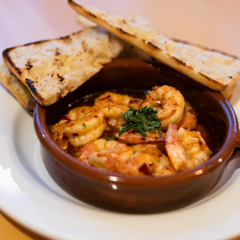 Spot prawns, Seasoned with Spices, Garlic, Olive oil and Baked in a terracotta bowl, served with crostini bread.