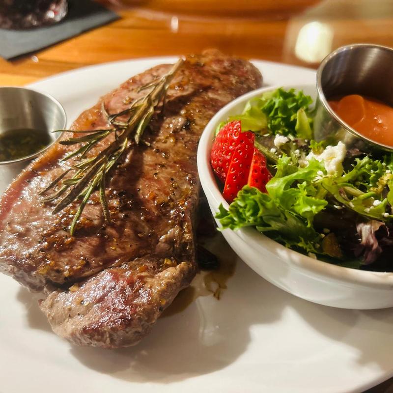 Bone in 18oz Ribeye cooked to perfection, house made chimichurri and chef's choice fresh vegetables.